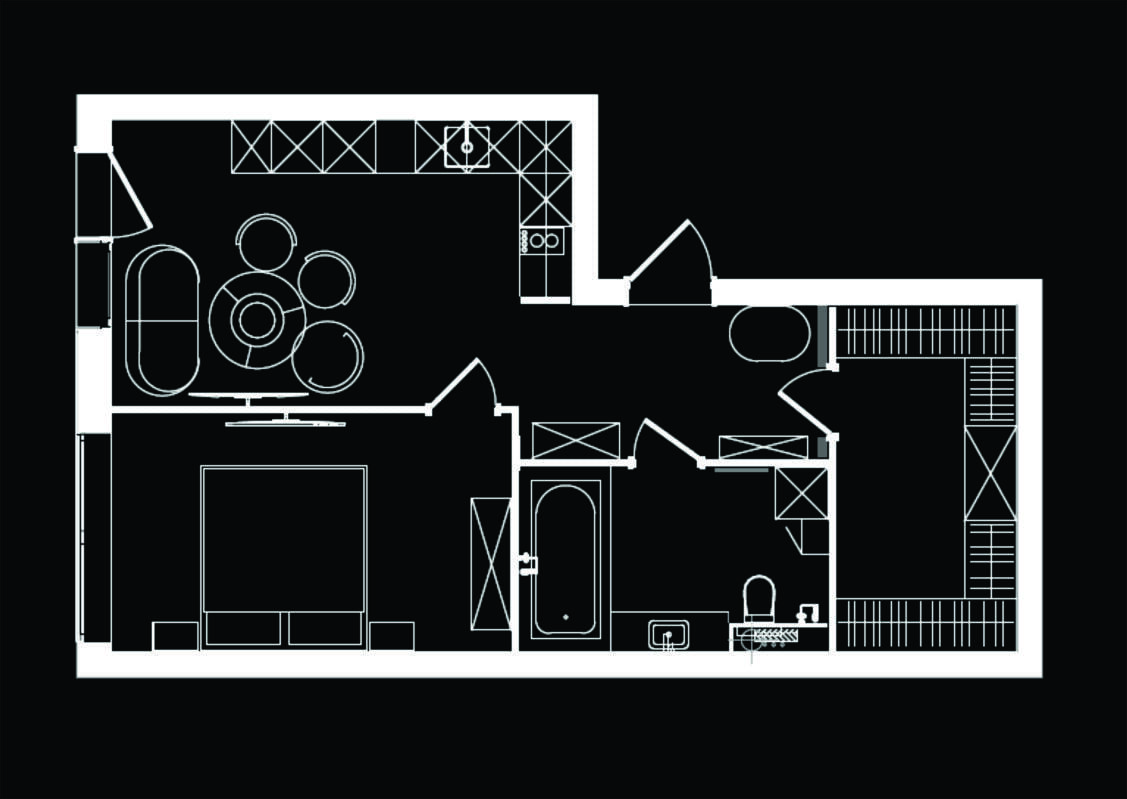 The zoning of the space was based on a specific target audience of future tenants, up to 35 years old, without children, with an above-average income, understanding modern trends in the interior industry, and valuing minimalism and functionality in space.